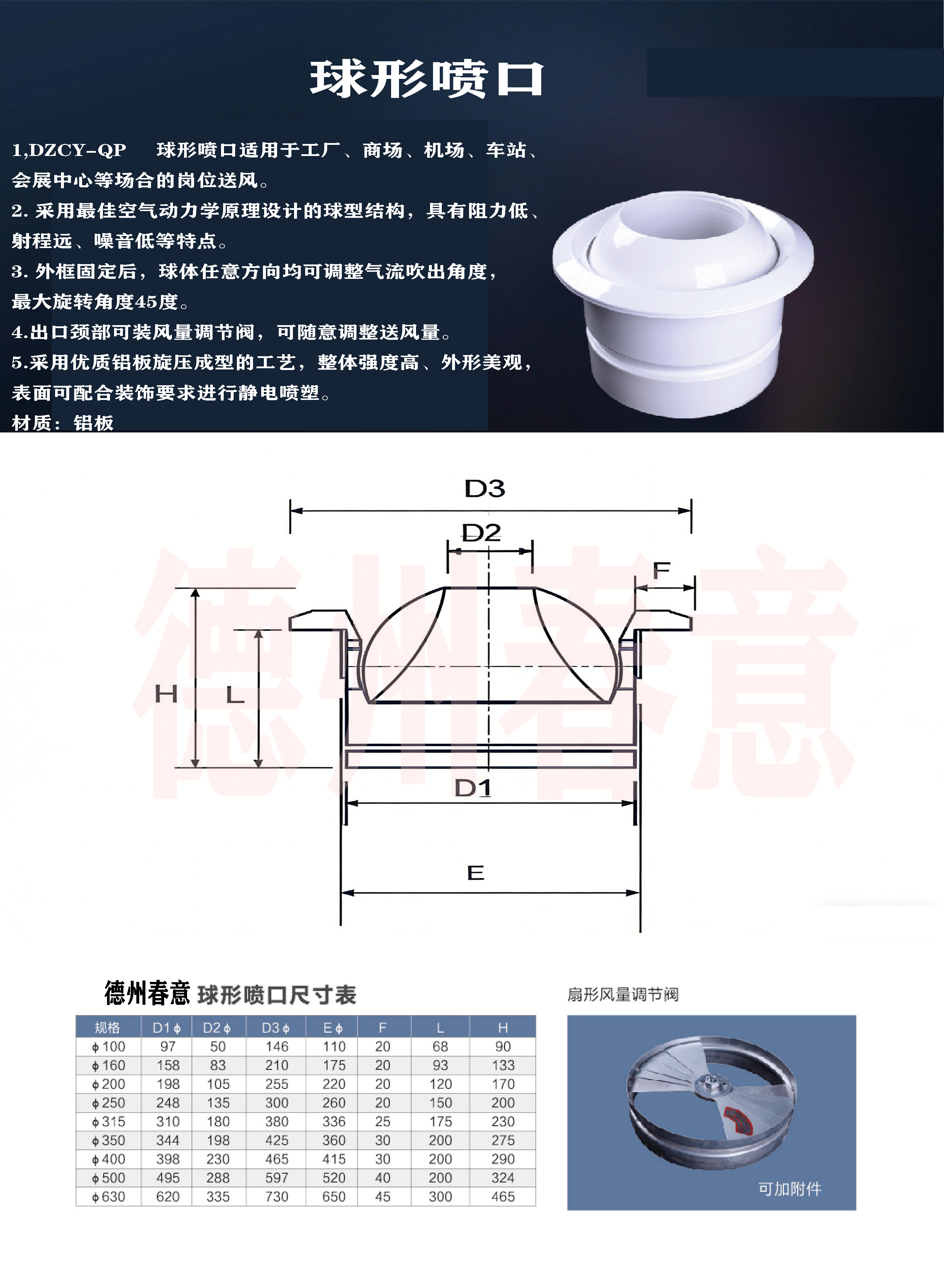 本產(chǎn)品是我公司新研制開(kāi)發(fā)的新型噴口。主要用于音樂(lè)廳、劇場(chǎng)、博物館、電影院、飛機(jī)場(chǎng)、球型噴口@選型參數(shù)@安裝批發(fā)球形噴口高鐵站等空調(diào)送風(fēng)與人員活動(dòng)范圍有較大間隔的環(huán)境中。