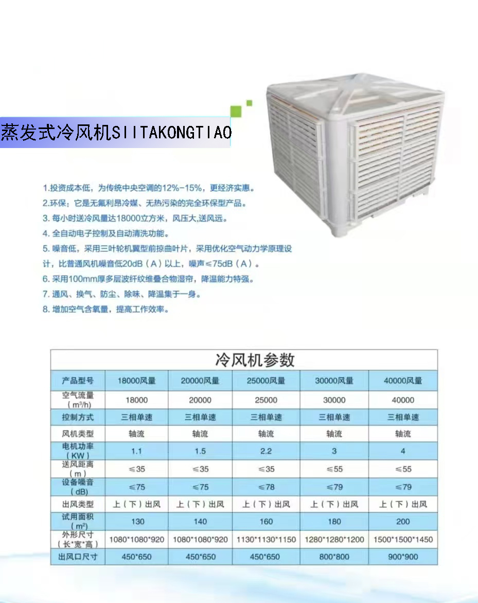 從工廠車間到商業(yè)場所,從倉儲物流到戶外臨時空間,蒸發(fā)式冷風(fēng)機(jī)憑借靈活便捷的安裝方式與卓越性能,成為各行業(yè)的降溫優(yōu)選。模塊化設(shè)計支持多臺組合,滿足不同場景需求;智能控制系統(tǒng)可遠(yuǎn)程調(diào)節(jié)風(fēng)速、濕度,操作簡單便捷。選擇蒸發(fā)式冷風(fēng)機(jī),不僅是選擇一份清涼,更是擁抱一種綠色節(jié)能的生活方式。